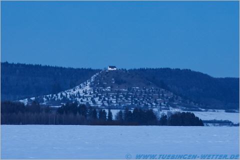 Nach Auflösung des Hochnebels erwartet uns sonniges Wetter mit Tageshöchttemperaturen im positivem, zweistelligen Bereich. Dabei kühlt es Nachts bei klarem Himmel deutlich ab, auf der Schwäbischen Alb sind Minusgrade im zweistelligen Minusbereich, wie die letzten Tage auch, zu erwarten. Auf der Schwäbischen Alb ab ca. 750 Meter ist nach wie vor tiefster Winter, während es im Flachland nur noch vereinzelt an schattigen Stellen ein paar Schneereste zu sehen gibt. Bis zum Wochenende wird sich an dieser Lage erstmal nicht viel ändern, wobei es zum Wochenende hin Nachts nicht mehr ganz so kalt wird. Das kommende Wochenende sieht, nach jetzigem Stand der Prognosen, eher düster, wärmer und regnerischer aus. Fernab vom Faschingstrubel ein paar Bilder vom 14.2.2015 von der Heuberger Warte bei Rottenburg am Neckar, zu sehen ist Rottenburg, im Vordergrund die Weggental-Kapelle.
