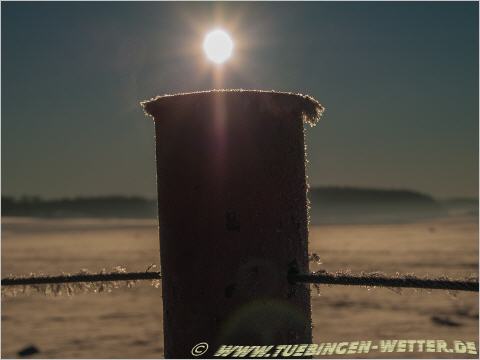 Direkt unterhalb der Sonne schaut der Tübinger Österberg aus der Nebeldecke heraus, Tübingen ist unter dem Nebel versteckt.