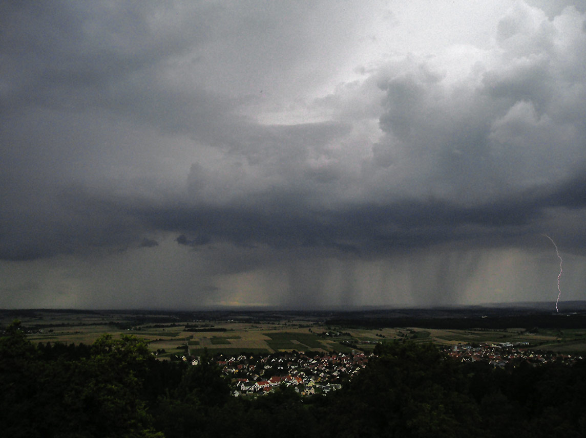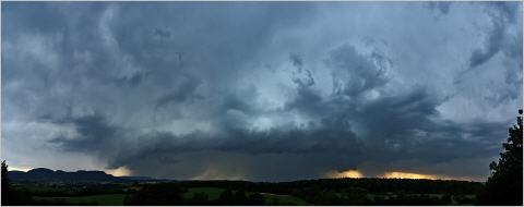 Abermals wurde Tübingen und die umliegenden Landkreise von schweren Gewittern getroffen. In Tübingen gab es viele umgestürzte Bäume durch Windböen die mit Starkregen einhergingen. Die Aufräumarbeiten waren den Tag über noch im vollem Gange. Viele grosse abgerissene Äste mussten beiseite geräumt werden. Hier ein Panoramabild vom Aufzug des Gewitters gegen 20 Uhr. Das Dunkle rechts neben dem grossen Niederschlagskern zeigt einen kleineren, weitaus heftigeren Kern, der gerade über Tübingen zieht.