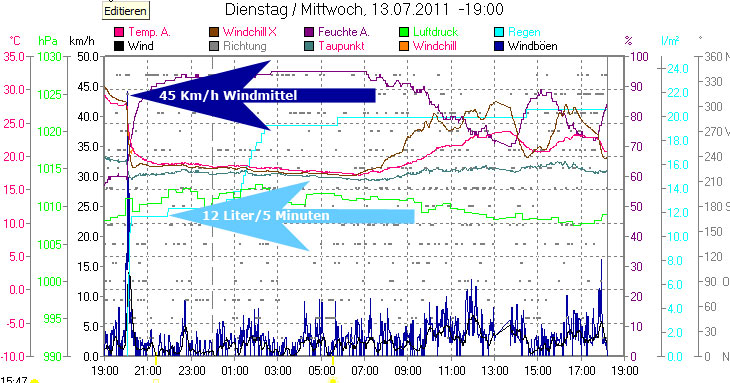 Die heftigen Gewitter vom 07.07.2011 in der Region zeichneten sich die letzten Tage schon anhand der Modellkarten so ähnlich ab, wie sie dann auch engetreten sind. Zur Nachmittagszeit warnte deshalb der Deutsche Wetterdienst vor schweren Gewittern mit Sturmböen, Hagel und erheblichen Niederschlagsmengen, was dann auch in der Neckar-Alb Region so eingetreten ist. In Tübingen und Reutlingen liefen etliche Keller voll und die Feuerwehren waren im Dauereinsatz. Die Flußpegel stiegen innerhalb kürzester Zeit rasant an und drohten auszuufern. Die Wetterstation hat eine Niederschlagsmenge von 52,9 Litern in den letzten 24 Stunden gemessen. Das ist in etwa halb soviel Niederschlag, wie es in einem normalem Juli insgesamt regnet. In Bingen im Landkreis Sigmaringen gab es eine Hagelmeldung von bis zu 8 cm Korngröße. Dort sind einige Autos, Dächer, Scheiben, etc. beschädigt/zerstört worden. Anbei noch 2 Bilder von den Gewittern, die in der Nacht noch an der Albkante entlang gezogen sind. Mehr zu den Unwettern auf der Seite von Tagblatt Online.