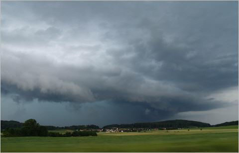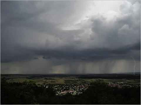 Heute bei schwülen 24°C gab es ab dem Mittag/Nachmittag immer wieder Gewitterbildungen in der Umgebung. Nichts dramatisches, aber schön anzuschauen war es trotzdem. Anbei 2 Bilder aus Hohenentringen bei Tübingen. Ich bitte die schlechte Qualität der Bilder zu entschuldigen, da sie nur mit meiner alten kleinen Digicam gemacht wurden. Auf dem ersten Bild ist sogar noch ein Blitz am rechten Bildrand zu sehen. Der müsste irgendwo zwischen Altingen und Kayh in einen Baum eingeschlagen haben.