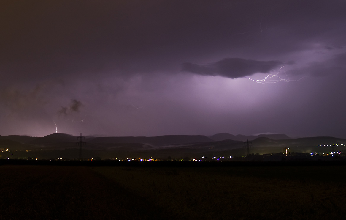Die Nächtlichen Gewitter festgehalten bei Degerschlacht (LK Reutlingen). Ganz rechts auf dem Bild ist der Rossberg zu erkennen.