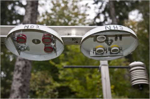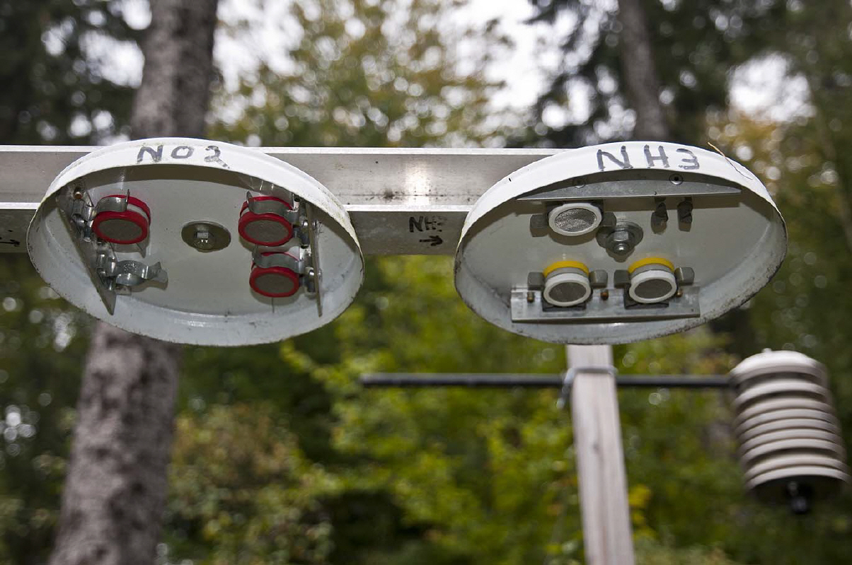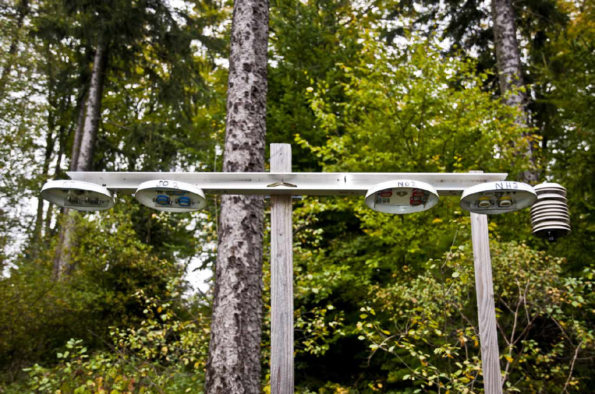 Hier an der Luftmessstation Odenwald sieht man einen kleinen Messpark, der Luftschadstoffe mit der passiven Probennahme misst.
