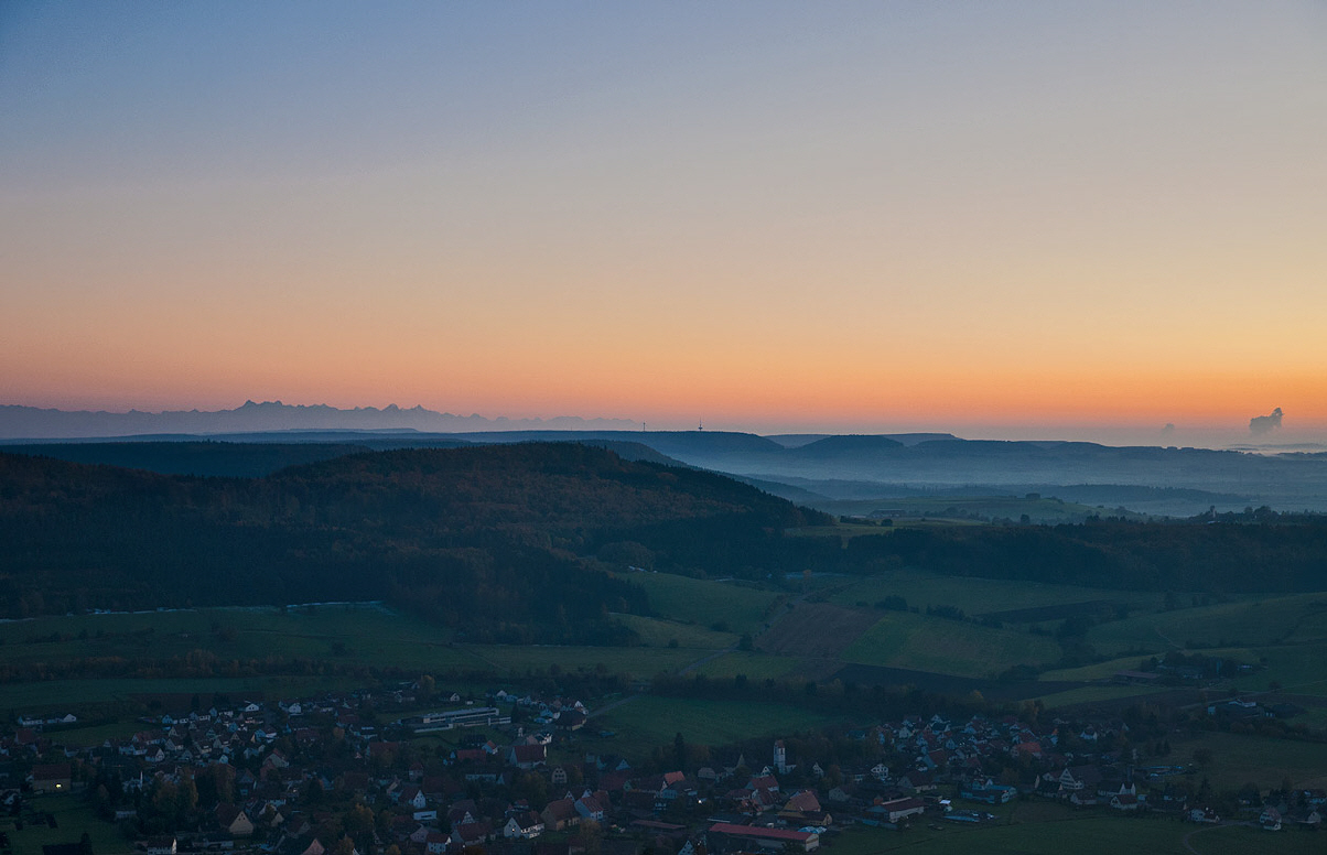 Nochmal die Schweizer Alpen mit Talheim im Vordergrund.