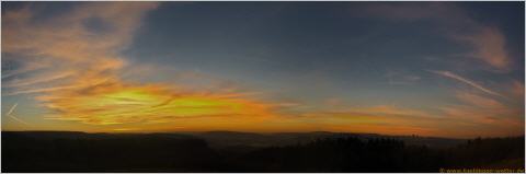 Heute Abend gab es, dank der hohen und mittelhohen Bewölkung, wieder ein farbenprächtigen Sonnenuntergang der besonderen Art. Hier einmal ein Panorama und noch zwei weitere Bilder, dieses wunderbaren Naturschauspieles. In den nächsten 3 Tagen gibt es beim Wetter erstmal keine großartigen Änderungen und es bleibt vorerst schön.