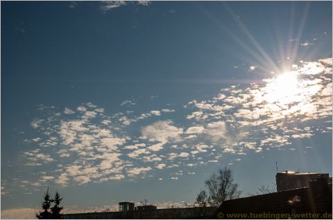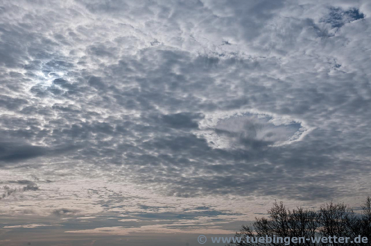Von ca. 12.15 bis 12.45 Uhr, gab es so genannte "Hole Punch Clouds" also "Wolkenlöcher" über Tübingen zu beobachten. Wie diese entstehen, können Sie bei Wikipedia nachlesen. Anbei 2 Bilder von diesem Naturschauspiel.