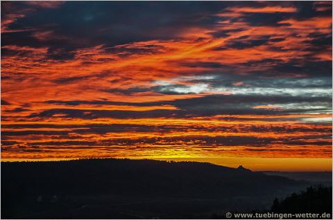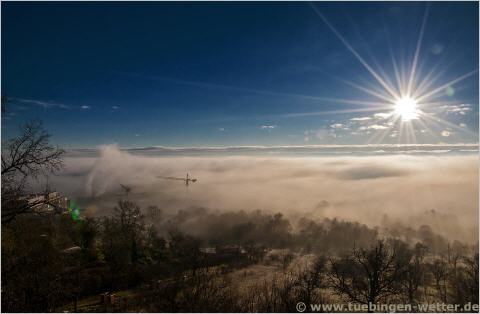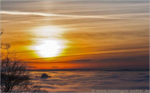 Recht frisch mit Temperaturen unter 0°C und stellenweise mit Reifglätte muß in dieser Sylvesternacht gerechnet werden. Dies gilt zumindest für Gebiete, in denen aufkommender Nebel ein Thema sein wird, bzw. wo es in den Abendstunden noch nass auf den Strassen ist. Nach Mitternacht zum morgen hin, ist sogar mit aufkommendem Glatteisregen zu rechnen ! Also seien Sie vorsichtig, nicht dass Sie im wahrsten Sinne des Wortes, ins neue Jahr hinein rutschen. Anbei die letzten Bilder des Jahres 2013, vom Sonnenuntergang über dem Nebelmeer gestern. Tübingen-Wetter wünscht allen einen guten Rutsch ins Jahr 2014 und schauen Sie auch nächstes Jahr wieder hier vorbei.