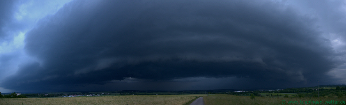 Glimpflich davon gekommen ist der Landkreis Tübingen, ausser einer fotogenen Gewitterfront mit Windböen, Platzregen und kleinem Hagel dürfte nicht viel passiert sein am Abend gegen 21.30 Uhr. Anderst dagegen im Landkreis Reutlingen, wo ein heftiges Gewitter bei Riedlingen schon am Nachmittag bereits Hagel um 5cm hervorgebracht hatte. Auch im Rest der Republik gab es im laufe des Tages immer wieder heftige Unwetter mit Hagel, Blitzschlag, Überschwemmungen und allem was dazu gehört, die teils große Schäden angerichtet haben. Hier ein Bild bei Kayh kurz vor dem Durchgang der abendlichen Gewitterfront.