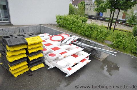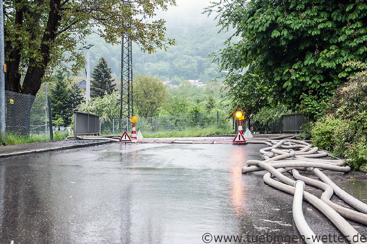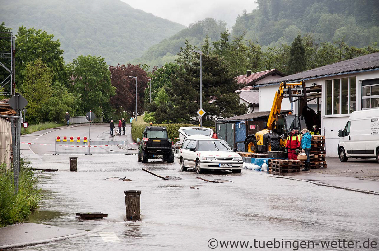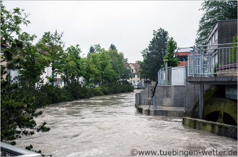 Gestern und Heute in den Morgenstunden wurden vielerorts die einstigen Rekordhochwasserstände zum Teil deutlich überschritten ! Am Sonntagmorgen gegen 3 Uhr wurde der einstige Rekordwasserstand des Neckars am Pegel Kirchentellinsfurt mit 5,914 Meter knapp überboten. Die einstige Rekordmarke von 5,90 Metern vom 24.05.1978 wurde somit um 1,4cm überboten! Da es gestern nach wie vor anhaltend und heftig geregnet hatte, die Zuflüsse am Oberlauf des Neckars wie die Starzel, die Eyach und deren Zuflüsse ebenfalls neue Rekordhöchststände zu verzeichnen hatten, wurden somit nochmals gewaltige Wassermassen in den Neckar verfrachtet. Da die Böden durch die anhaltenden Niederschläge kein Wassert mehr aufnehmen konnten, alle Flüsse schon mehr oder weniger Hochwasser führten, kam es dann gestern und in den Morgenstunden zu diesem extremen Hochwasser. Möglich wurde diese Lage durch 3 aufeinanderfolgende Tiefdruckgebiete aus Osten kommend, die die letzten Tage ihre enormen Niederschläge immer wieder über Süddeutschland "abgeladen" hatten. Anbei nun die Bilder des letzten Tages und der Nacht und Morgenstunden aus der Region. Nachmittags um kurz vor 16 Uhr an der Echaz in Betzingen, bei einem Pegelstand von 1,70 Metern (Pegel Echaz in Kirchentellinsfurt), die Vorbereitungen auf die zweite Hochwasserwelle laufen auf Hochtouren.
