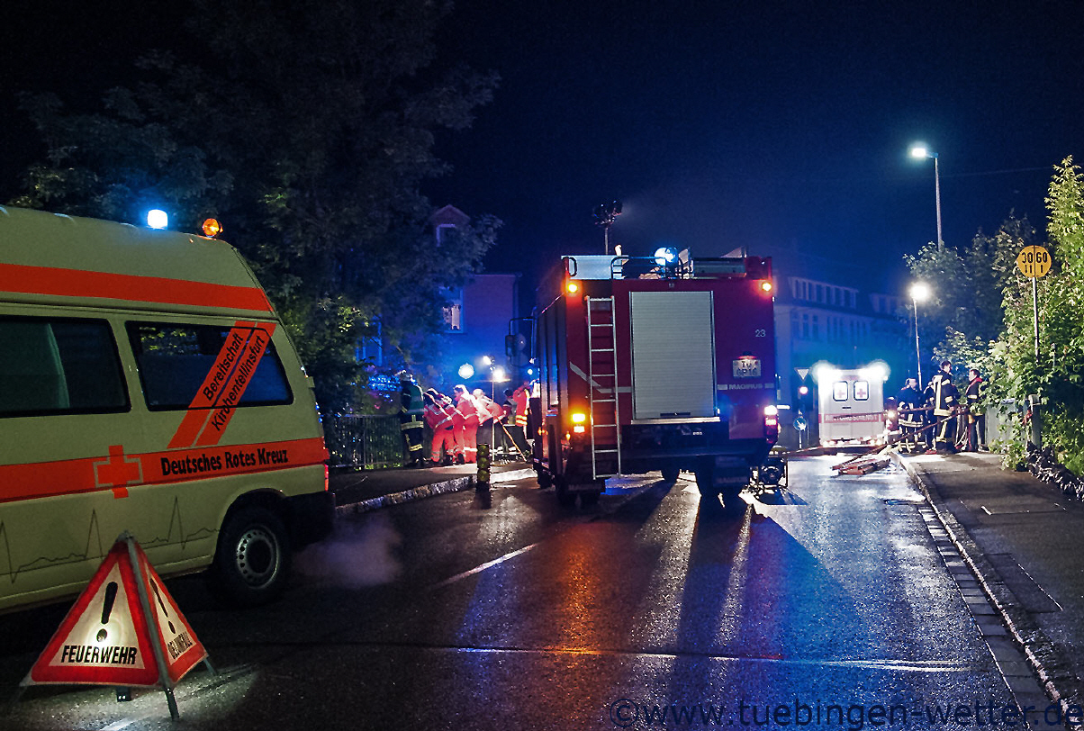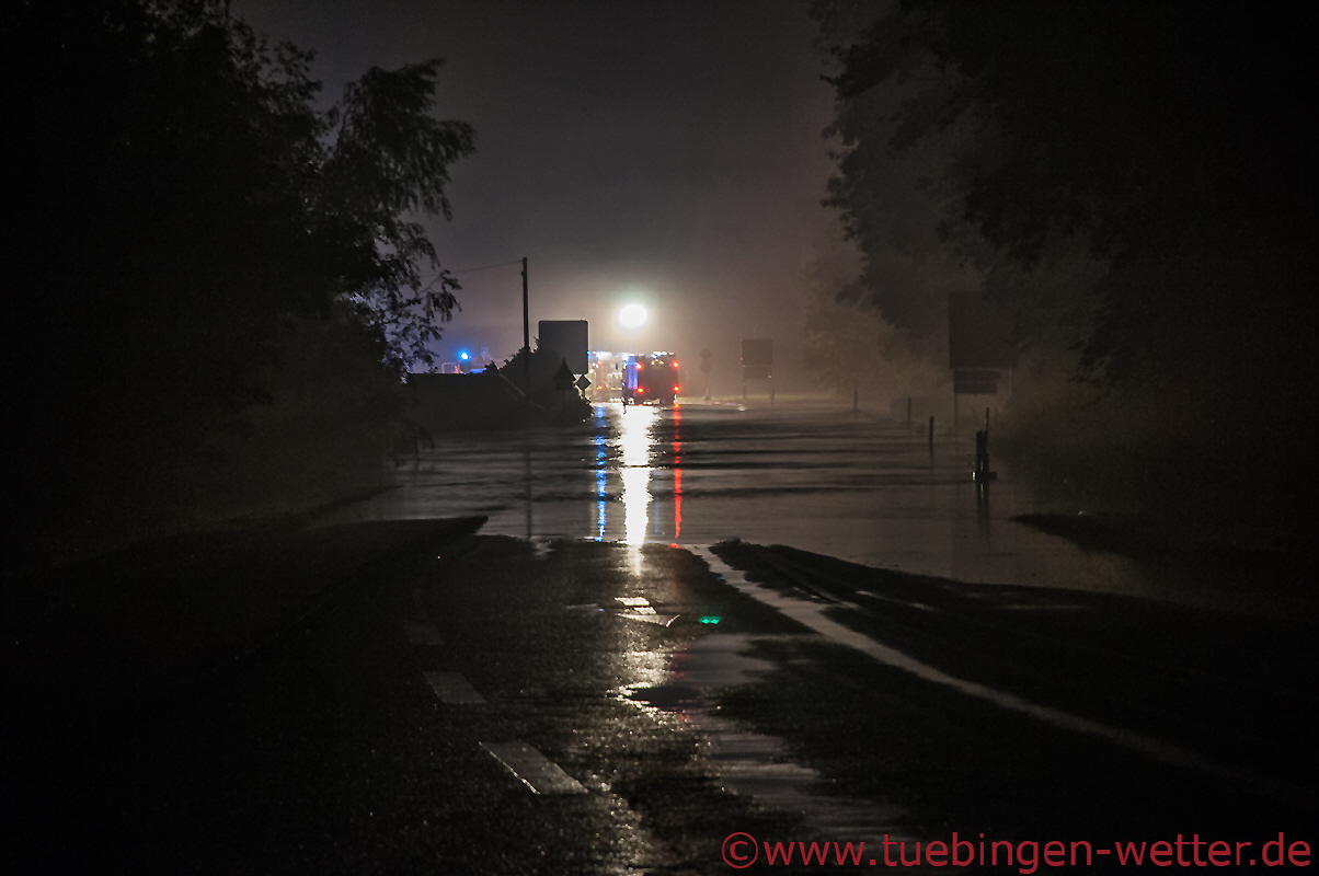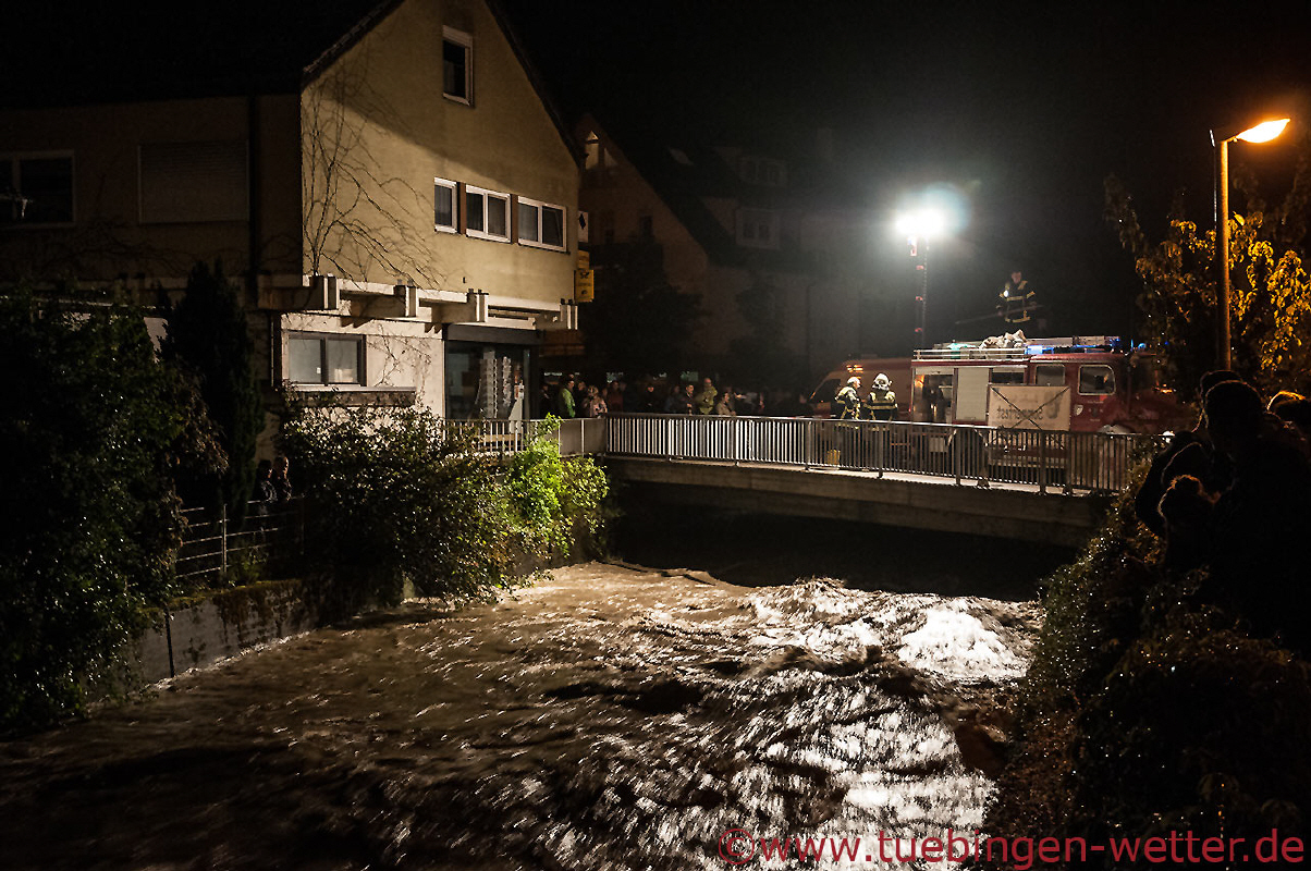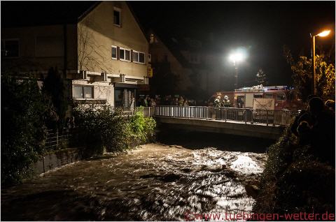 Zurück im Landkreis Tübingen um die Mitternachtszeit, verschärfte sich dann die Lage an der Echaz bei Kirchentellinsfurt wieder, auf Grund des erneut einsetzenden Regens zuvor und dem Rückstau des Neckars, der bis dahin auf neue Rekordwasserstände anzusteigen drohte. Hier ein Bild aus Kirchentellinsfurt, wo Feuerwehrleute versuchten, einen in die Echaz gesprungenen Mann zu retten, der bis jetzt allerdings noch nicht gefunden wurde.