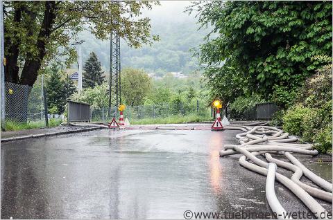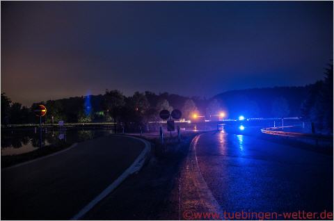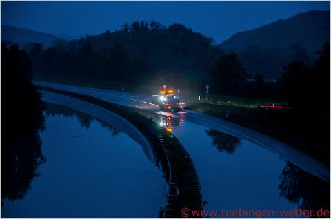 4.10 Uhr, der Neckar steht bei 5,88 Meter ! Die Auffahrt der B27 von Kirchentellinsfurt nach Tübingen, auch hier kein Durchkommen mehr. Direkt, ca. 100-200 Meter hinter dem Streifenwagen, befindet sich das Pegelhäuschen, wo die Wasserstände des Neckars gemessen werden.