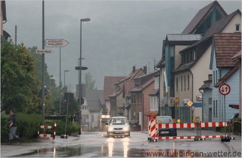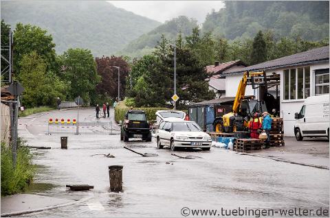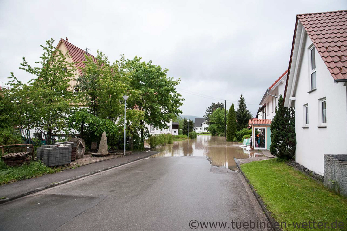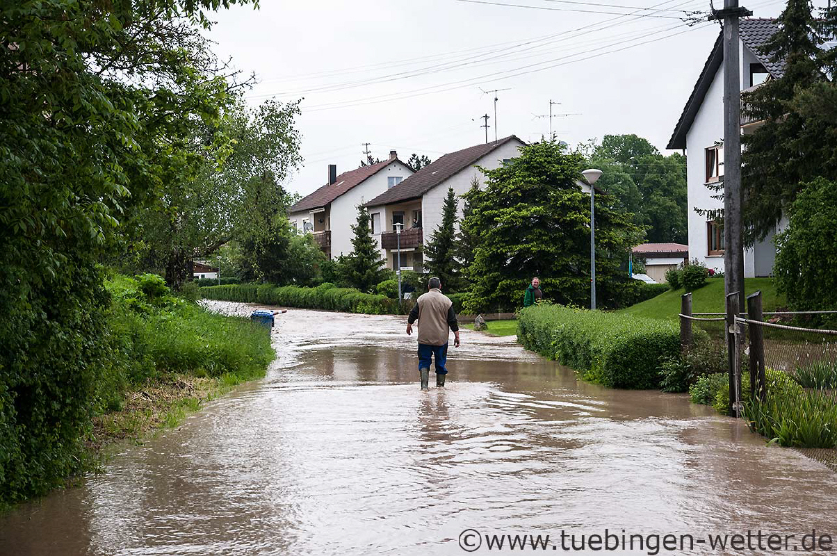 20.20 Uhr in Owingen an der Eyach, hier kommt gerade die Hochwasserwelle an und drückt das Wasser nach Owingen hinein und setzt ganze Staßenzüge unter Wasser. Hier ist die Eyach eigentlich sehr weit weg vom Ort, aber das Wasser findet seinen Weg.