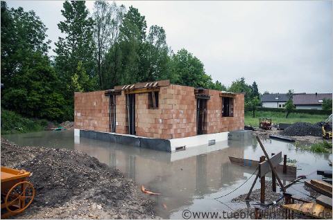 Dieses Haus in Reutlingen wurde von der Echaz unterspült und musste evakuiert werden. Im Hintergrund wird versucht, mit einem Bagger die angrenzende Baustelle abzusichern.