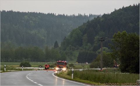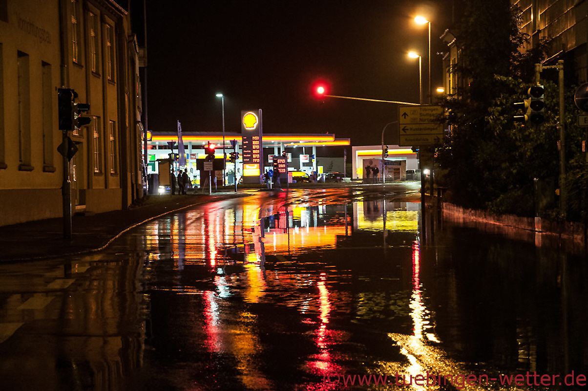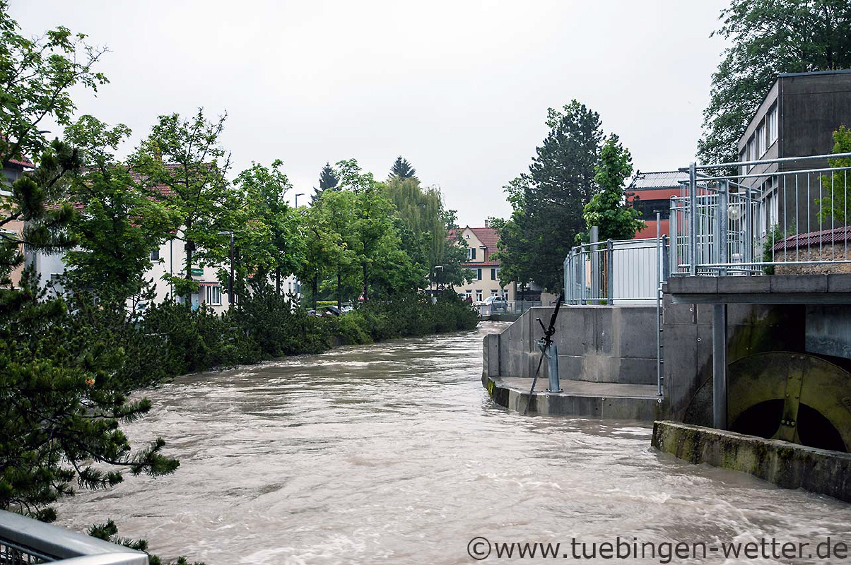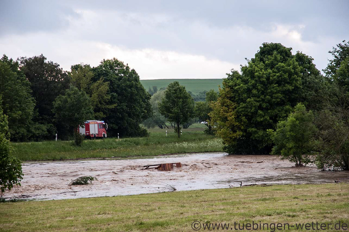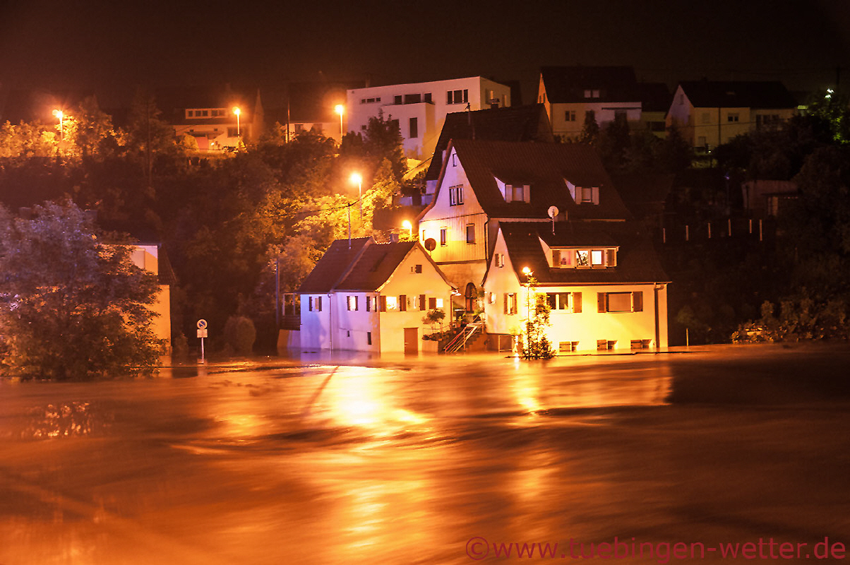 Gegen 0.30 Uhr wurde die Suche nach dem in die Echaz gesprungenen Mann in Wannweil abgebrochen. Viele Schaulustige hatten sich dort zu nächtlicher Stunde eingefunden um das Spektakel zu verfolgen. Zu diesem Zeitpunkt hatte die Echaz immer noch eine Höhe von über 2 Metern am Pegel Wannweil ! Auch dort wurden übrigens neue Rekordhöchststände gemessen. Der am 10.08.2002 gemessene Höchtpegelstand wurde um 2,2 cm übertroffen und ist nun mit 2,242 Metern die neue Rekordmarke, die dort 1,5 Stunden vorher am 1.6.2013 um 23 Uhr gemessen wurde !