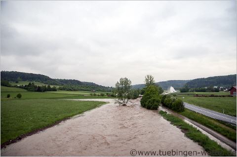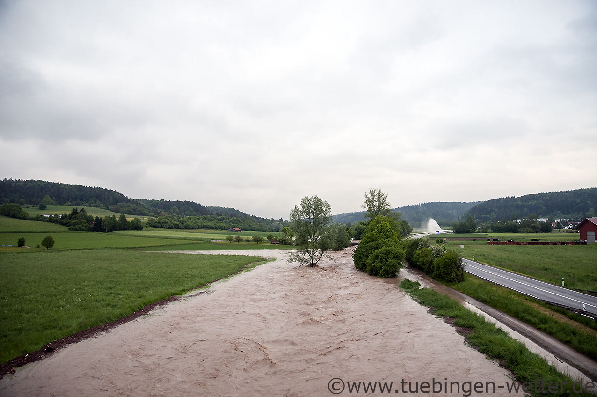 So sieht ein "Jahrhunderthochwasser" von fast 3 Meter aus, aufgenommen beim/nahe Pegelhäuschen der Eyach in Owingen. Dazu sei bemerkt, dass es sich bei der Eyach um ein kleines Flüßchen handelt, das normalerweise um die 30cm Wasser führt ! Von der Durchflußmenge in Kubikmetern Wasser pro Sekunde, wurden Werte erreicht, die der Neckar bei erreichen der Hochwassermarke von 3,30 Metern in etwa erreicht. Das ist in Anbetracht der Größe des Flüßchens eine beachtliche Menge Wasser.
