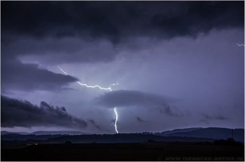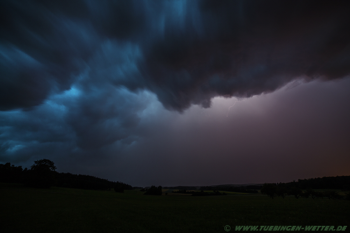 Am gestrigen Montagabend durfen viele Leute ein, für unsere Region eher seltenes Naturschauspiel, beobachten. Eine stark ausgeprägte Gewitterlinie aus der Schweiz heraus kommend, mit vielen Blitzen und Dauergrollen, zog gegen 21 Uhr im Landkreis Tübingen auf. Diese Linie hatte zeitweise viel Wind und Regen im Gepäck, so dass es vereinzelt Schäden gab, die sich aber in Grenzen hielten. Alles in allem konnte man aber noch von Glück sagen, dass kein, bzw. nur vereinzelt, kleiner Hagel dabei gewesen ist. Hagel ab 2-3cm bei dieser Linie und mit den entsprechenden Windböen, hätten sehr große Schaden anrichten können. Abei ein erstes Video vom Aufzug bei Villingen-Schwenningen.