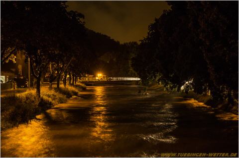 Dies wiederum hat zur Folge, das viele Flüsse und Bäche innerhalb kürzester Zeit sehr stark angestiegen sind, wie hier die Ammer in Tübingen bei der Nürtinger Strasse gegen Mitternacht. Das Fluttor bei Lustnau wurde vorsorglich geschlossen, da auch der Goldersbach stark angestiegen ist. Momentan sind die Gewitter erstmal abgezogen, aber was die Nacht und der Tag an neuen Regenmengen noch bringen wird, ist noch nicht genau absehbar. Begleitet wurde das ganze mit Blitz und Donner, in Wurmlingen ist der Blitz in ein Mehrfamilienhaus eingeschlagen, mehr dazu auf Tagblatt-Online.