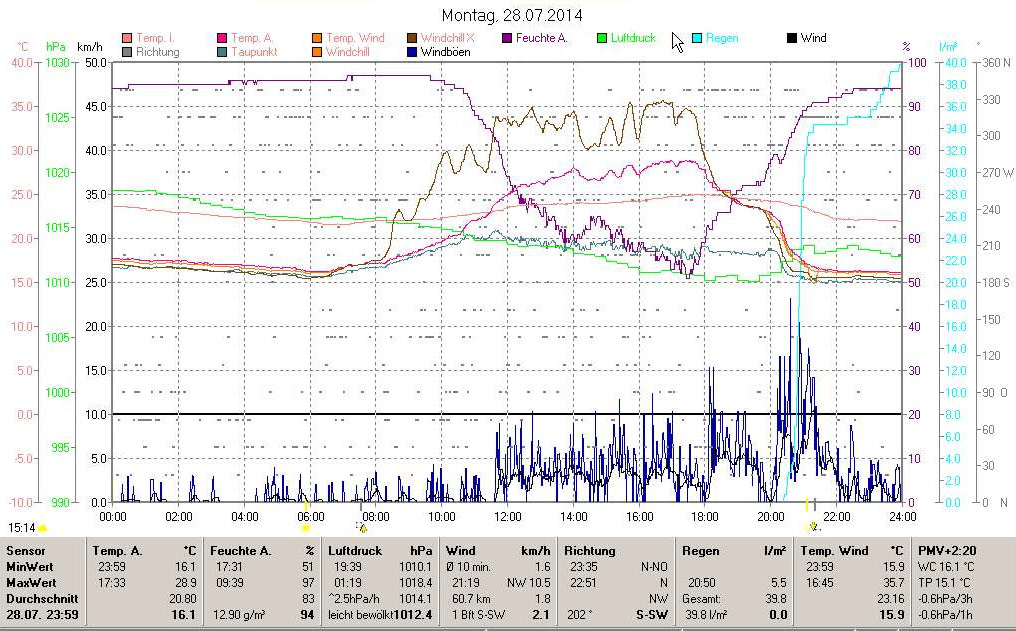 Diese Gewitterwolken hatten zwar vereinzelt nur kleinen Hagel mit im Gepäck, dafür aber um so mehr Regen, was die Tagesgrafik der Wetterstation Tübingen zeigt. Bis zu 40 Liter pro Quadratmeter sind dort gegen 20.15 Uhr vom Himmel gefallen, so viel wie sonst in einem halben Monat in etwa zusammen kommen !