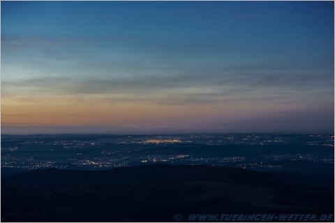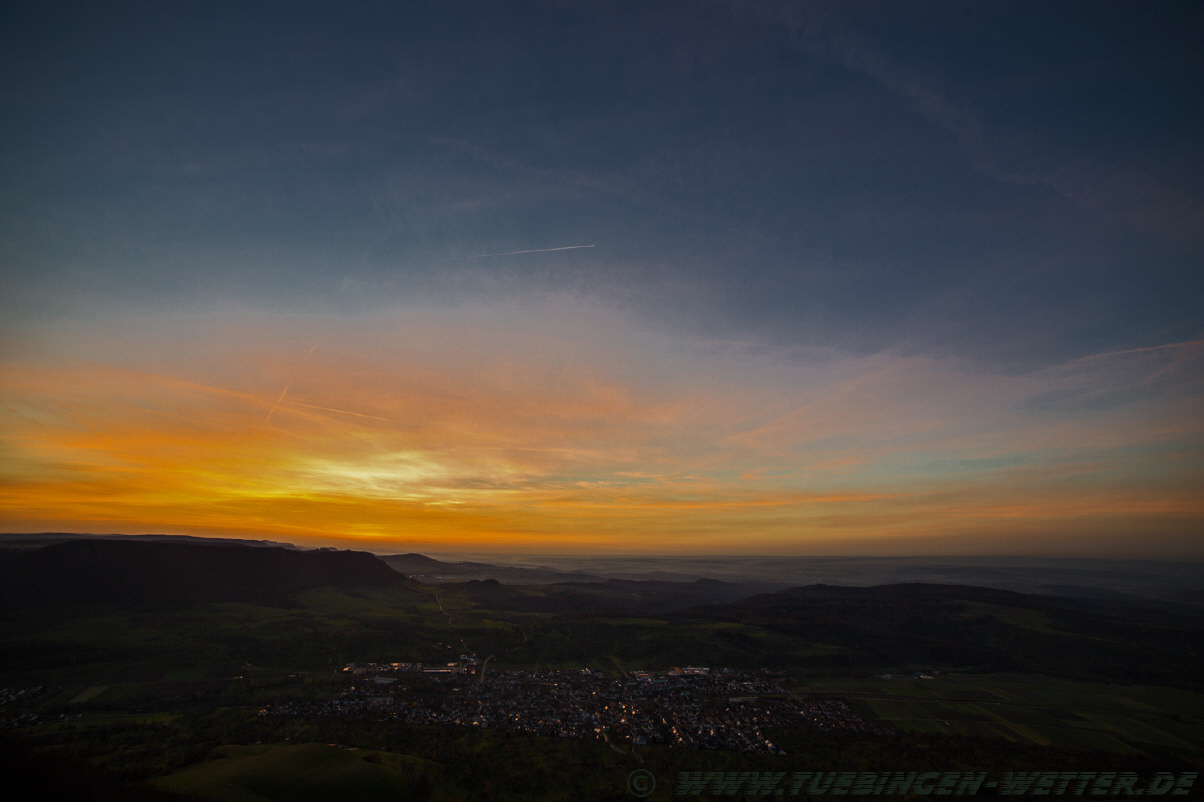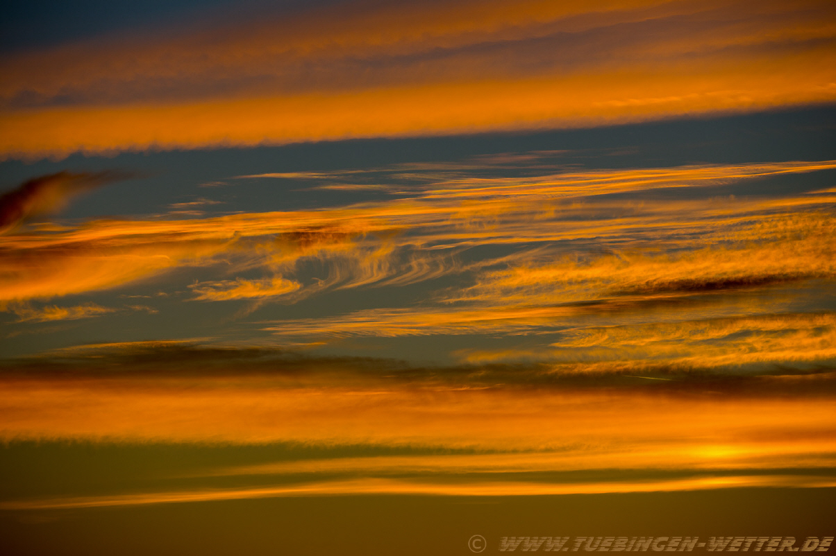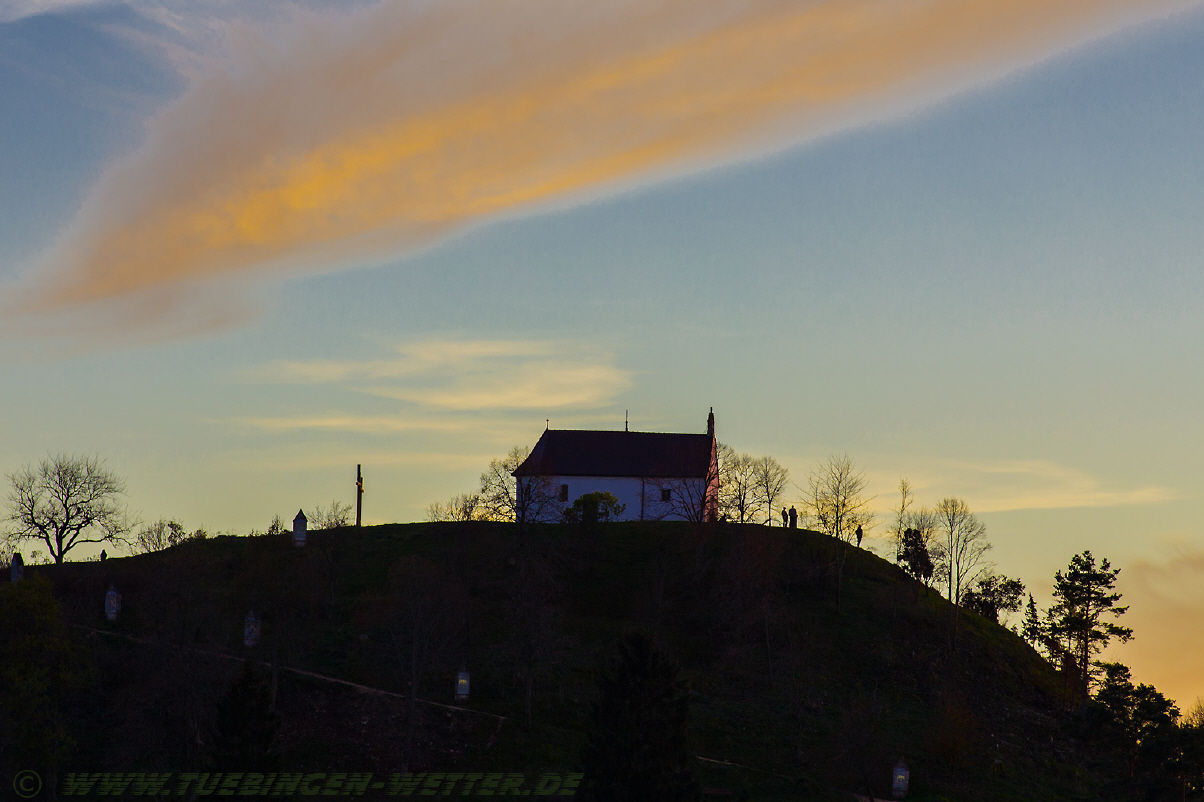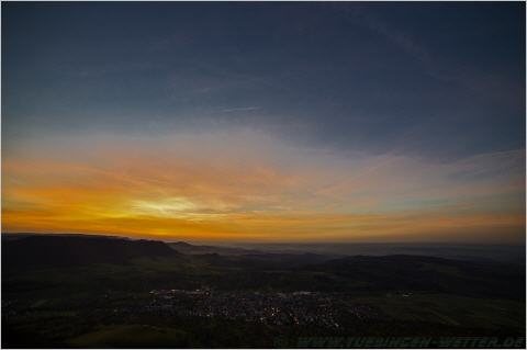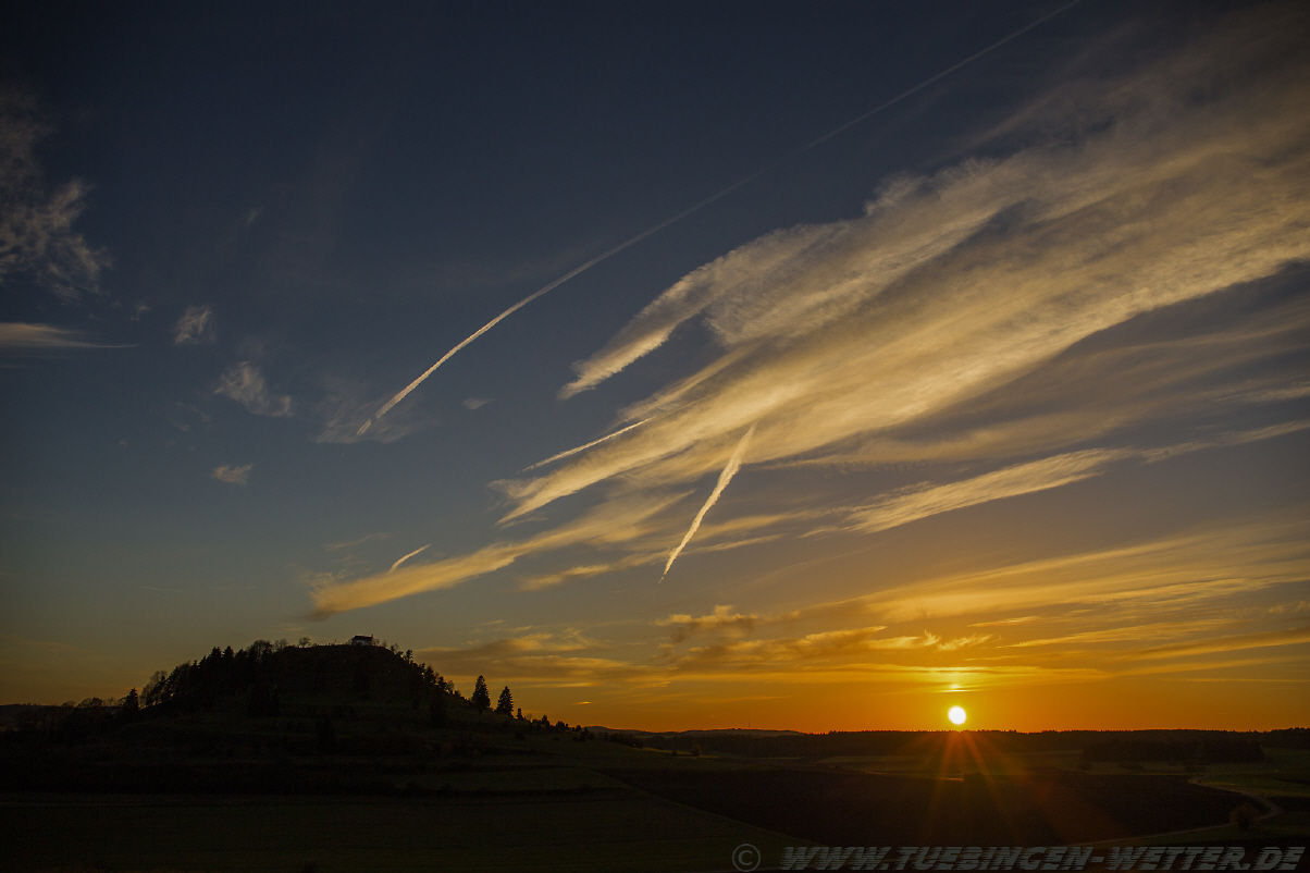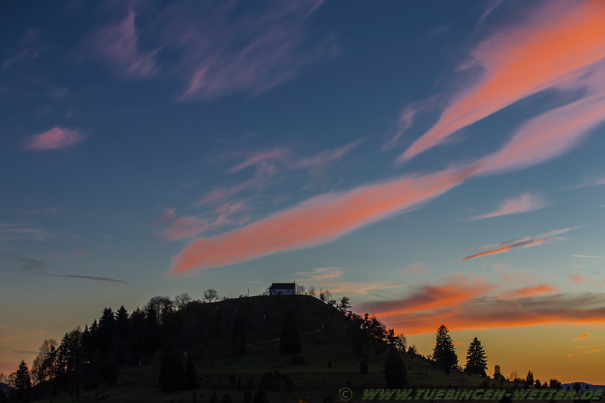 Heute bestes Feiertagswetter bei Temperaturen über 20°C und Sonnenschein. Nachts um die 5°C, nach Auflösung des Nebels dann wieder den ganzen Tag Sonne satt. So beständig wird es wohl bis Montag bleiben, danach unbeständiger, regnerisch und windig. Solange es noch so schön ist, sollte man morgens bzw. abends, einmal den Blick in den Himmel richten. In letzter Zeit sind die Sonnenauf und Untergänge wirklich traumhaft schön, wie dieser hier am Abend bei Salmendingen auf der Schwäbischen Alb.