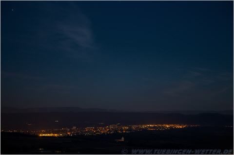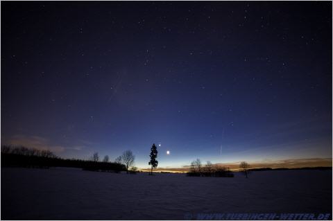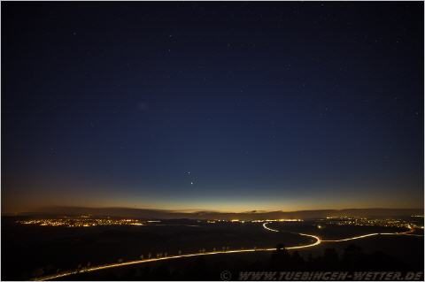 In der Bildmitte auf Höhe der Tannenbaumspitze überhalb der Venus, ist noch der Mars zu erkennen.