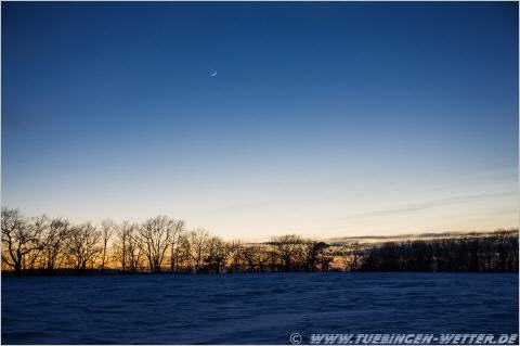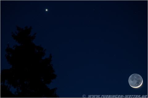 Die Neumondsichel mit der Venus schräg links darüber.