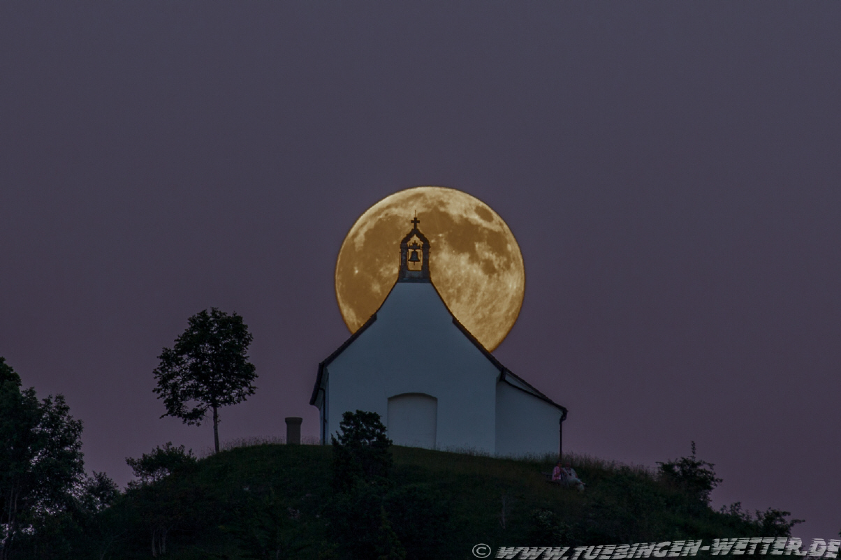 Der gestrige Tag mit 34,6°C Höchsttemperatur gegen 17 Uhr, brachte schon einen kleinen Vorgeschmack auf die kommenden heissen Tage. Das angenehme an diesem Wetter sind die Abend bzw. Nachttemperaturen, die geradezu zu einem Vollmondspaziergang einladen, wie hier auf der Salmendinger Kapelle.