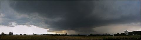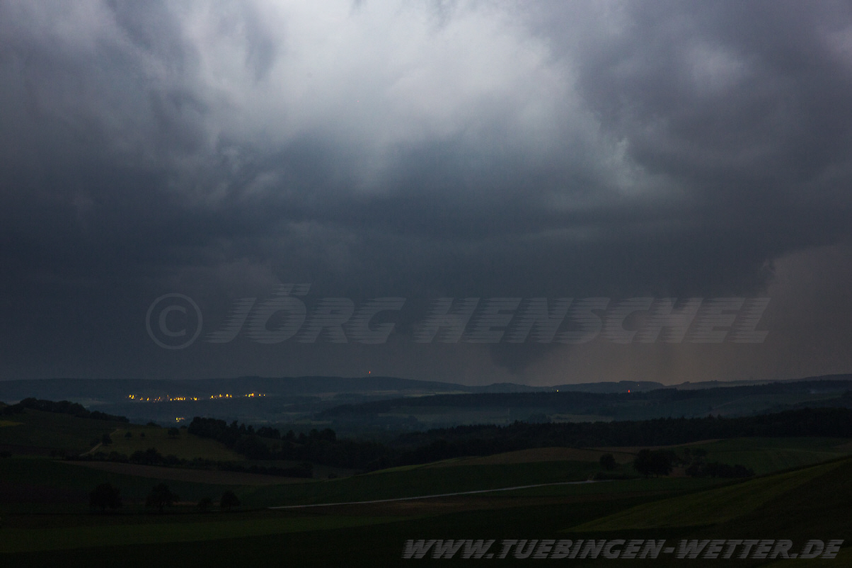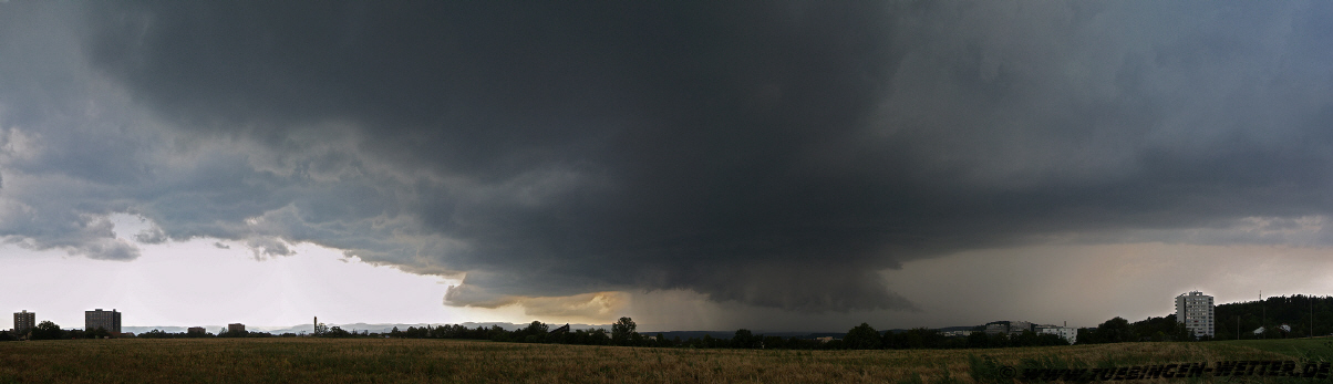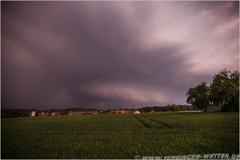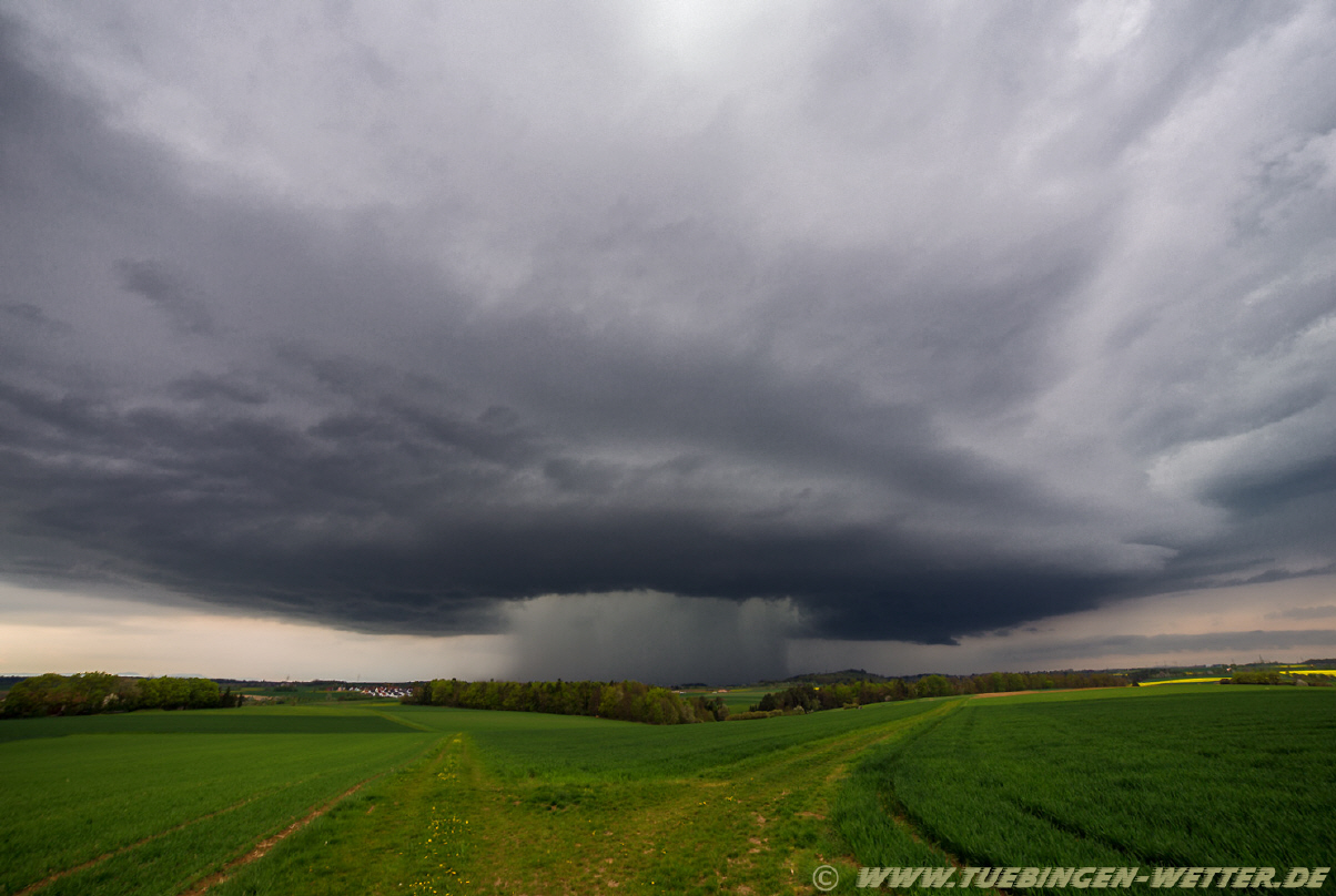 Spannende zwei Wettertage mit Tageshöchstwerten um 30°C pünktlich zu den Eisheiligen erwarten uns. Ähnliche Gewitter wie unten abgebildet vom 20.7.2007 könnten Tübingen am Mittwoch treffen. Damals gab es Hagel bis 5cm, vor allem im Südosten von Tübingen Stadt. Nach jetzigem Stand der Modellrechnungen wird Hagel auch am Mittwoch wieder ein Thema sein, wobei dieser durchaus wieder Dimensionen um die 5cm und größer annehmen kann. Der Gewitterauftakt findet am heutigen Dienstagnachmittag / Abend statt, wobei sich die Gewitteraktivität wohl eher auf die Nordhälfte von Baden-Württemberg beschränken dürfte. Bei so einer Wetterlage sind Überraschungen möglich und es ist nicht ausgeschlossen, das es den Landkreis Tübingen treffen könnte. Eine Unwetterwarnung am heutigen Dienstag für den Landkreis Tübingen wurde schon von der Unwetterzentrale ausgesprochen, es ist daher empfehlenswert, den Himmel heute und morgen etwas genauer im Auge zu behalten. Morgen gegen Nachmittag / Abend kommen dann die nächten Gewitter, die Unwettercharakter annehmen können mit Blitz, Donner, Sturm/Orkanböen und großem Hagel, wobei auch das Tornadopotential nicht unerheblich ist. Welche Landkreise/Regionen es genau treffen wird, lässt sich zum jetzigem Zeitpunkt nicht genau vorher sagen. Es besteht momentan jedenfalls kein Grund zur Panik, aber informieren Sie sich bitte auf der Seite des Deutschen Wetterdienstes und der Unwetterzentrale über das aktuelle Wettergeschehen bzw. Unwetterakutwarnungen für Ihren Landkreis !