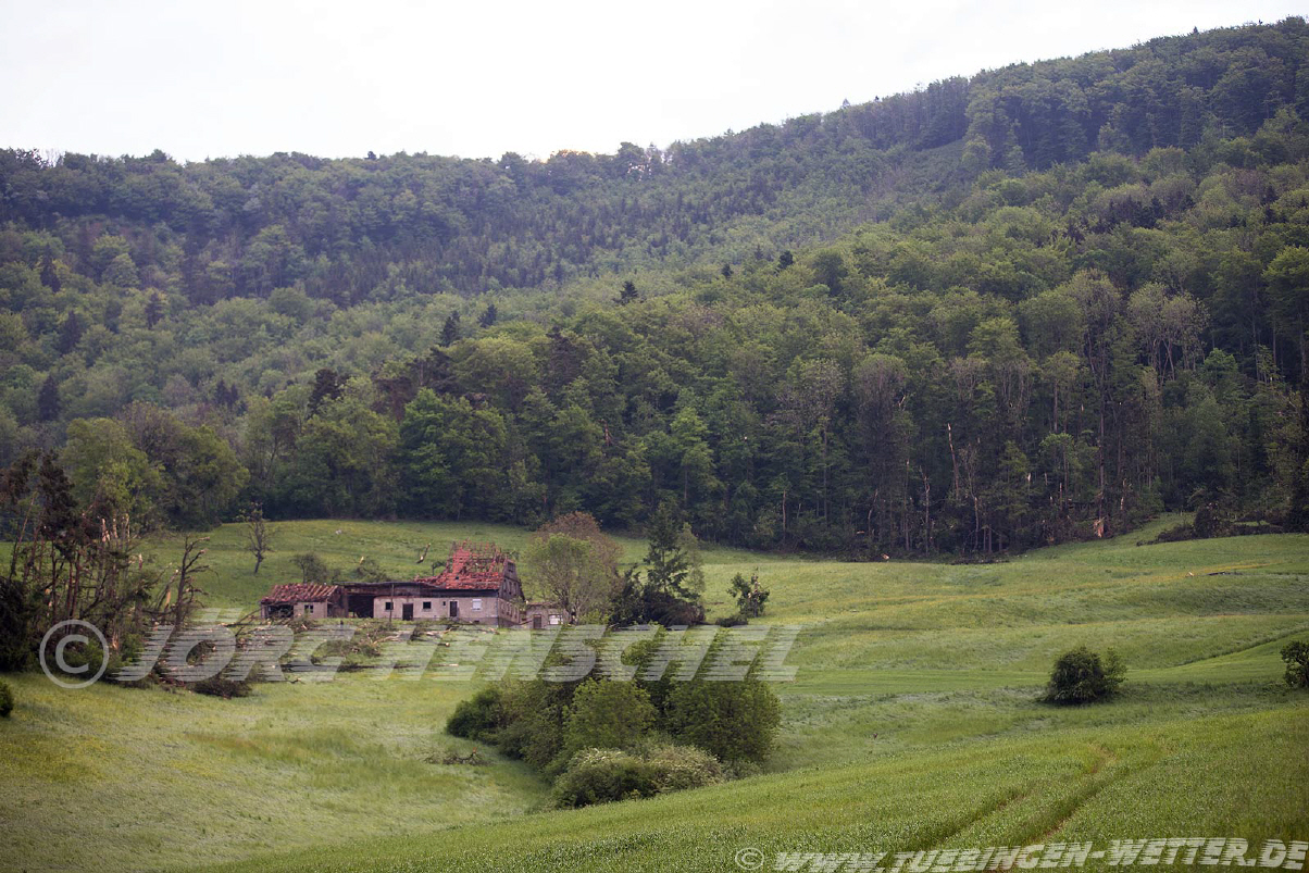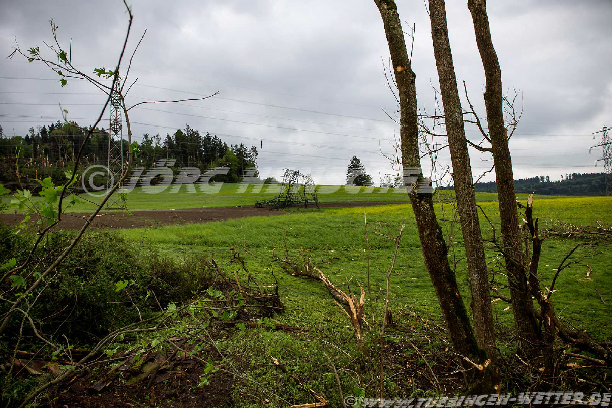 Heute gab es gegen 21.30 Uhr an der Deutsch-Schweizerischen Grenze bei Blumberg / Fützen einen Tornado. Dieser riß eine 220 KV Hochspannungsleitung um, beschädigte ein unbewohntes Haus samt Scheune schwer und zog eine etwa 15 bis 20 km lange Schneiße der Verwüstung durch Feld, Wald und Wiesen. Die Schneiße dürfte an den breitesten Stellen bis ca. 400 Meter, wenn nicht mehr haben. Anbei ein paar Bilder vom Tornado und von den Schäden, mehr folgt später.