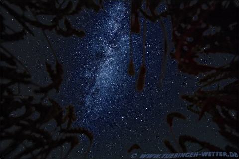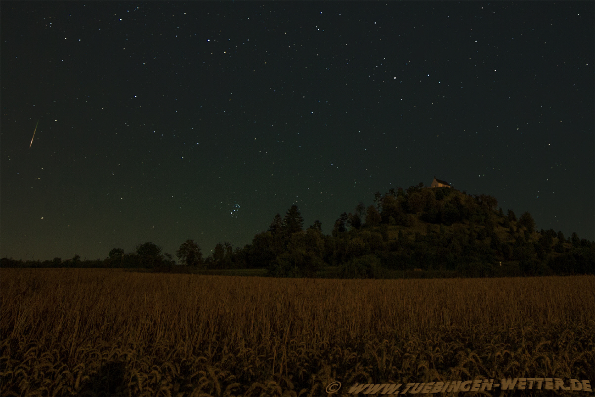 Leider war es in der Nacht zum 12.8.2016 so stark bewölkt, dass eine Beobachtung der Perseiden in fast ganz Deutschland unmöglich gewesen ist. In der darauf folgenden Nacht hatte Petrus aber ein Einsehen und bescherte bestes Beobachtungswetter. In der zweiten Nachthälfte kurz nach Monduntergang bildeten sich dann teilweise Nebelbänke in den Senken der Albhochflächen. Dies hatte wiederum durch die hohe Feuchte zur Folge, das die Objektivlinse innerhalb kurzer Zeit immer wieder stark beschlagen ist und man ständig mit putzen beschäftigt war, was dann teilweise unscharfe Bilder produzierte (Bild1). Nichts desto trotz gab es einige schöne Meteore in dieser relativ lauen Nacht zu beobachten.