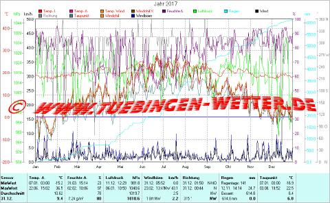 Im unteren Bild ist das komplette Wetterjahr 2017 mit allen relevanten Meßwerten noch einmal dargestellt.
