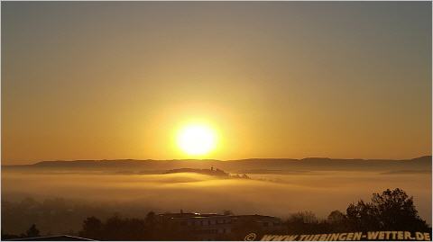 Direkt unterhalb der Sonne schaut der Tübinger Österberg aus der Nebeldecke heraus, Tübingen ist unter dem Nebel versteckt.